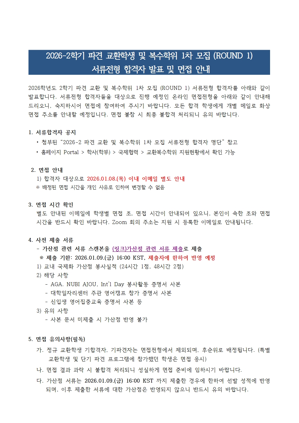 2) 가산점 관련 서류는2026.01.09.(금) 16:00이내 의 기한 내 제출 바라며, 제출자에 한하여 가산점 반영 예정임을 유의 바랍니다. (제출 링크: 구글폼(클릭))